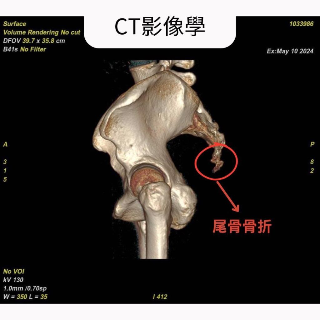 在初步X光影像檢查中,林醫師發現患者的尾椎骨折且有錯位不穩定的情形,因此除了止痛藥物以外,同時也建議邱小姐調整坐姿、合併使用中空坐墊以及接受物理治療等,大約兩周後邱小姐的症狀就慢慢緩解了。